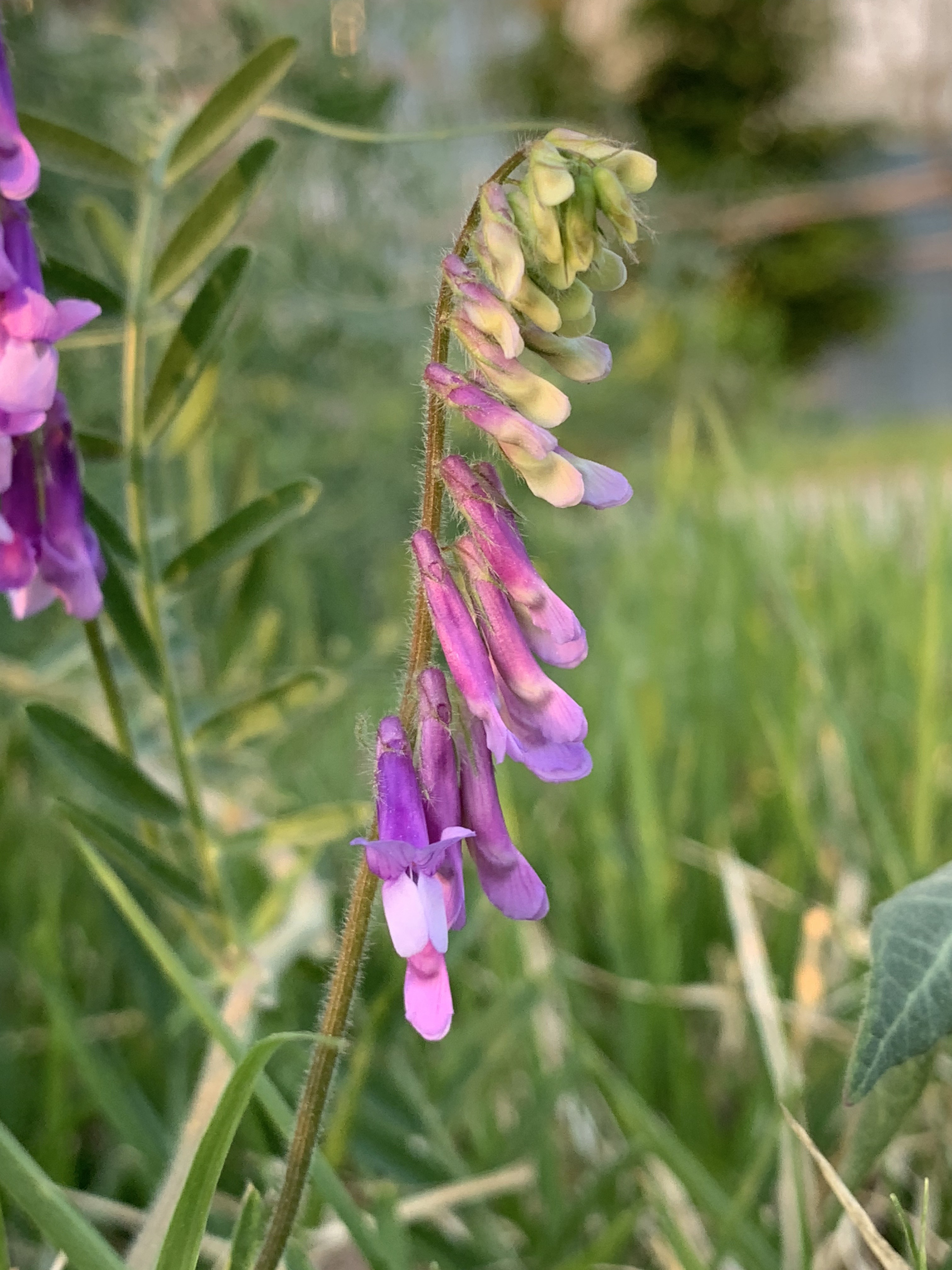개화시기는 5~6월이며, 윗부분의 잎겨드랑이에서 나온 총상꽃차례에 보라색 또는 분홍색의 꽃이 달린다. 꽃 역시 길쭉한 모양으로, 약 1.4~1.5cm 정도의 길이이며, 꽃받침은 곱추같고 끝이 5갈래로 갈라진다.