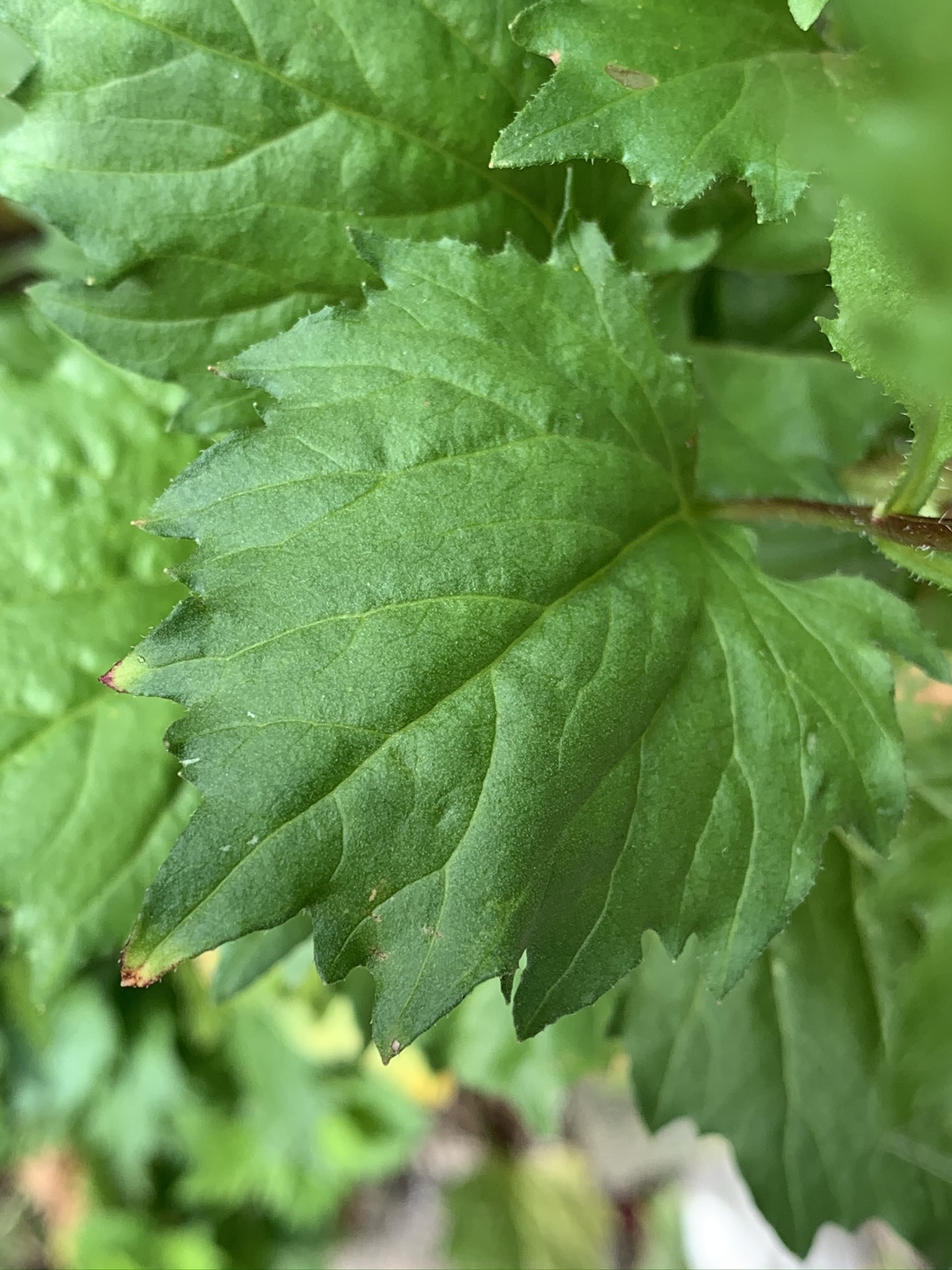 잎은 난형(달걀모양)으로 끝이 뾰족하며, 어긋나기로 난다. 길이는 약 5~6cm, 너비 3~4.5cm이며 불규칙한 톱니가 있다. 잎자루의 길이는 약 7~8.5cm로, 좁은 날개가 있고 잎과 더불어 털이 있으며, 위쪽으로 갈 수록 짧아진다.