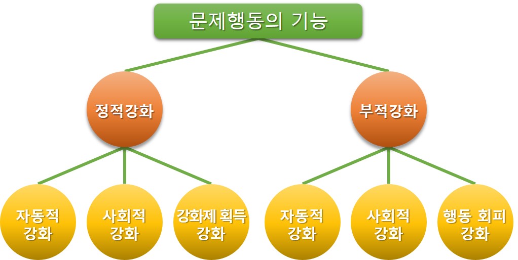- 문제행동이 갖는 기능은 크게 정적강화와 부적강화로 구분할 수 있다. 정적강화는 문제행동을 함으로써 긍정적인 결과를 얻어내는 것이며, 부적강화는 문제행동의 결과로 좋아하지 않는 어떤 일에서 벗어나거나 회피할 수 있게 되는 것이다.