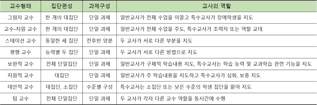 <장애인 등에 대한 특수교육법> 제2조 6항에는 통합교육을 '특수교육대상자가 일반학교에서 장애유형, 장애 정도에 따라 차별을 받지 않고 또래와 함께 개개인의 요구에 적합한 교육을 받는 것'이라고 정의하고 있다. 이렇게 일반학교의 일반학급에서 또래와 함께 적합한 교육을 받는 통합교육을 성공적으로 이루어내기 위해서는 특수교사와 일반학급 교사의 협력이 필수적이며, 이 외에 학부모, 학교 관리자 등이 모두 협력해야만 한다.