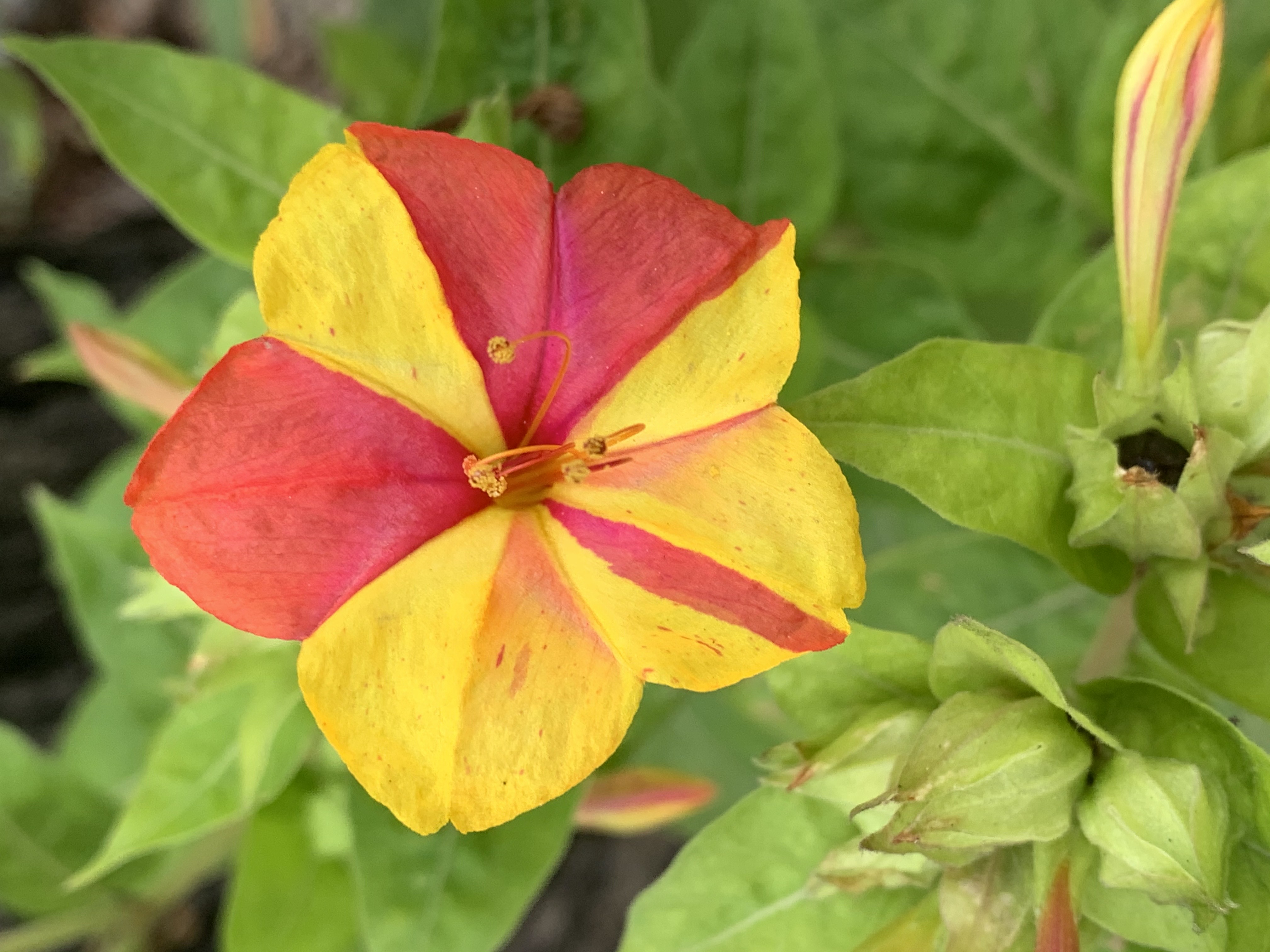 개화시기는 6월경부터 10월까지이며, 저녁때 피기 시작하므로 저녁지을 시간을 알려주는 꽃이라고도 했다. 어두울 때 피어 아침이면 지는데, 나팔꽃 모양의 꽃이 가지끝에 취산꽃차례로 핀다. 붉은색, 흰색, 노란색 등으로 다양한 색이 섞여있는데, 자가교배 또는 타가교배를 통해 분홍색, 자주색, 크림색 등 더 다양한 색상과 무늬가 나타난다. 수술 5개가 밖으로 나오고 암술대가 길게 밖으로 나온다. 분꽃이라는 이름은 배젖이 밀가루 같다고 해서 붙여진 이름이라고 한다.