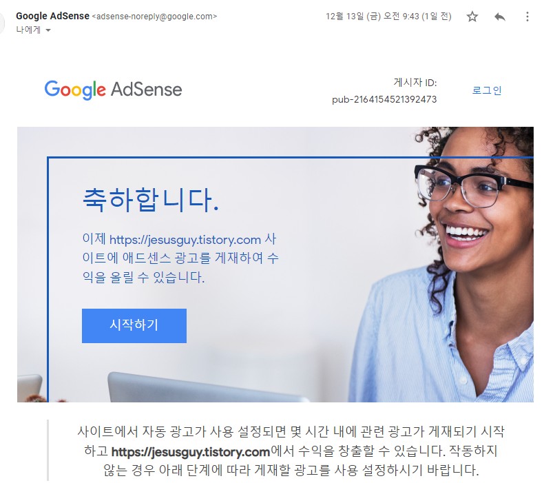 - 메일 본문에 있는 '시작하기' 버튼을 클릭하면 구글 애드센스 홈페이지로 연결된다.