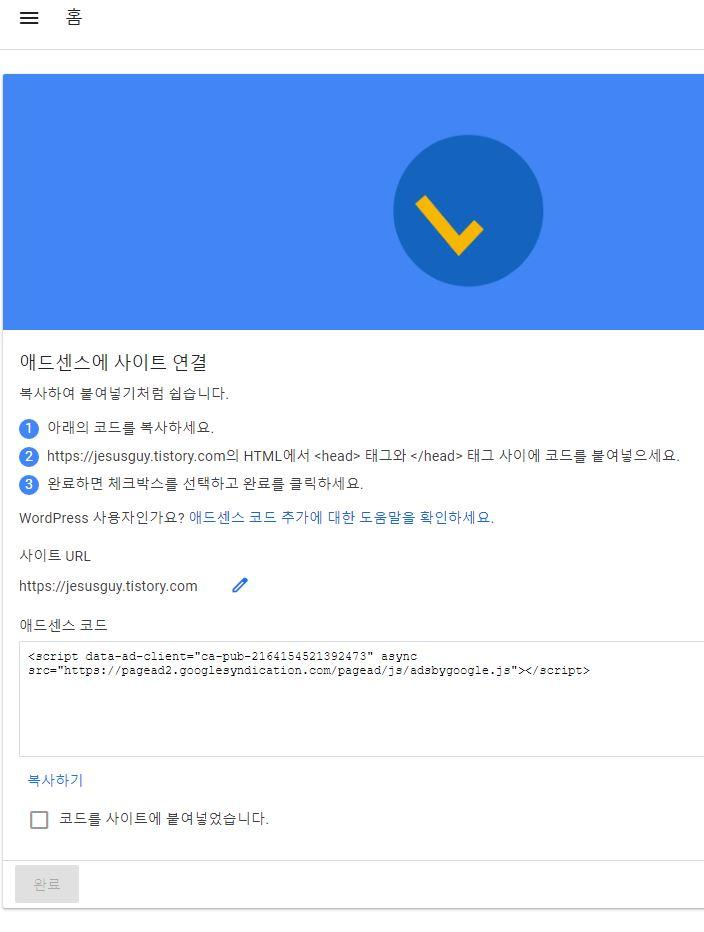 - 구글 애드센스에 사이트 연결 페이지에서 애드센스 코드가 있던 자리 아래 '코드를 사이트에 붙여넣었습니다'에 체크한 후 '완료' 버튼을 클릭한다.