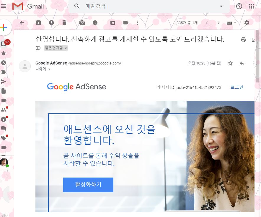 - 여기까지 완료하면 구글에서 메일을 보내, 환영메시지와 함께 곧 광고를 게재할 수 있게 도와주겠다고 희망의 메시지를 전해준다.