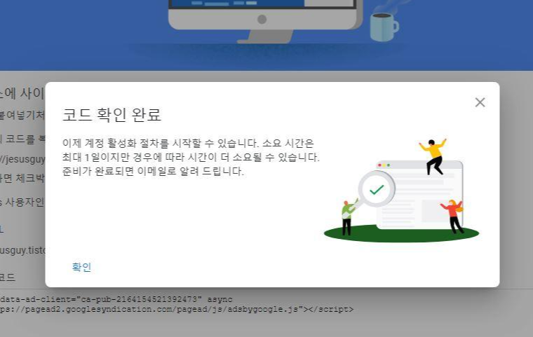 - 내 블로그에 애드센스 코드가 붙여졌는지 자동으로 확인하여 코드 확인 완료 페이지가 뜨면 확인 글자를 클릭한다.