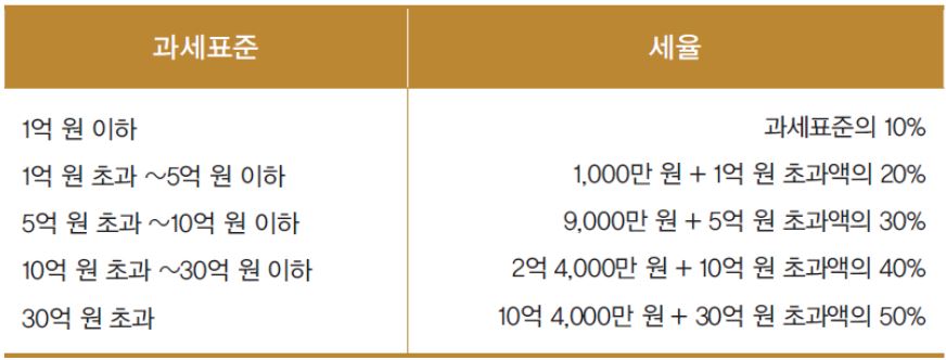 이 두 세금의 세율구간은 똑같다. 1억원 이하는 10%, 1억원 초과~5억원 이하는 20%, 5억원 초과~10억원 이하는 30%, 10억원 초과~30억원 이하는 40%, 30억원이 넘으면 그 이후로는 50%이다. 다만, 상속세는 사망자의 재산 전체에 부과되는데, 증여세는 증여 받는 개별 재산 기준으로 세금이 매겨지므로, 증여세가 상속세보다 더 적은 것이 보통이다.