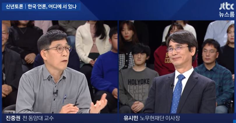 1월 1일과 1월 2일 이틀에 걸쳐서 JTBC 신년특집 대토론을 방송한다. 1월 1일 진중권, 유시민, 이창현, 정준희 등 4명이 출연하여 손석희 사장의 사회로 '한국 언론, 어디에 서 있나'라는 주제로 토론이 진행됐다. 어제 보고 거의 진중권 전 동양대 교수의 코미디쇼라고 봐야 하지 않나 하는 생각이 들었다. 진중권 전 교수와 유시민 노무현재단 이사장과의 만남부터가 잘못된 만남이었던 것 같지만, 아마 JTBC 측에서 시청률과 화제성 견인을 위해 일부러 이 둘을 붙인 것이 아닌가하는 생각이 든다.