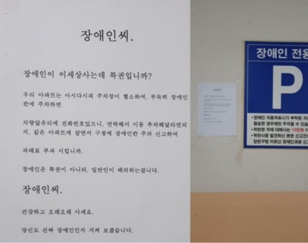 거동이 불편한 장애인들을 위한 장애인전용주차구역. 대부분의 많은 사람들이 잘 지키고 있지만, 일부 몰지각한 비양심적인 사람들 때문에 장애인전용주차구역과 관련한 이슈가 종종 보이곤한다. 최근에도 장애인전용주차구역 규정을 위반하고도 되려 당당하게 신고자 또는 장애인을 향해 협박성 경고문을 붙인 사례가 인터넷 커뮤니티 등을 통해 알려져 화제가 되었었다. 장애인전용주차구역 위반 신고는 누구나 할 수 있기 때문에 반드시 장애인이 신고했다는 보장도 없는데 무턱대고 불특정의 장애인을 상대로 '장애인씨 건강하고 오래오래 사세요'라며 빈정댔다. 신고 당한 사람은 다른 비장애인들의 의식수준이 다 자기 같을 것이라고 생각했나보다.