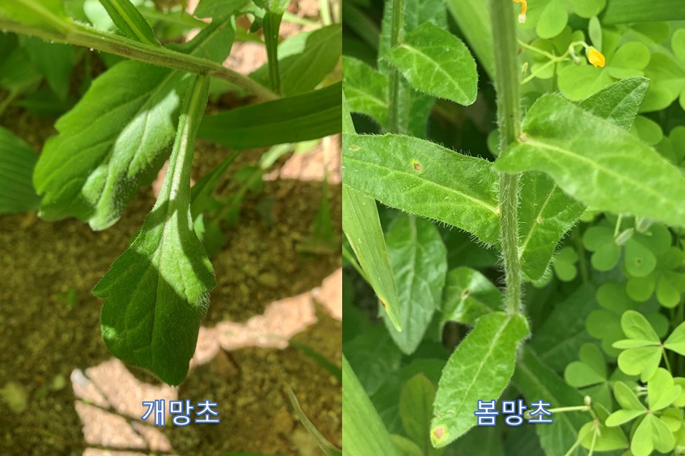 잎도 가만보면 개망초나 봄망초나 비슷한 것들이 많이 보이기 때문에 잎사귀 하나하나 일일이 자세히 보고 구별하려고 하면 좀 스트레스 받을 수 있을 것 같다. 왼쪽 사진처럼 잎을 살펴봐서 줄기에 가까워지는 기부가 가늘어지면서 날개가 있는 잎자루 모양이 있으면 개망초, 오른쪽 사진처럼 잎자루가 없이 줄기를 감싸듯 잎몸이 바로 줄기에 달려있는 잎이 있다면 거의 봄망초일 가능성이 크다 생각하고 넘어가는 게 좋을 듯.