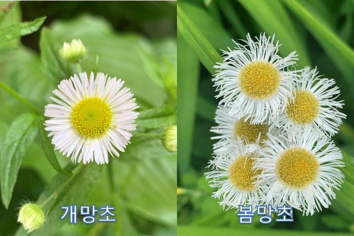 개망초는 설상화가 상대적으로 가지런하고 정돈된 반면, 봄망초의 설상화는 개망초보다 가늘고 힘이 없어 그런지 어수선하고 자유분방한 모양이다. 혀꽃의 수도 개망초보다는 봄망초가 1.5배 가량 더 많다고 한다.