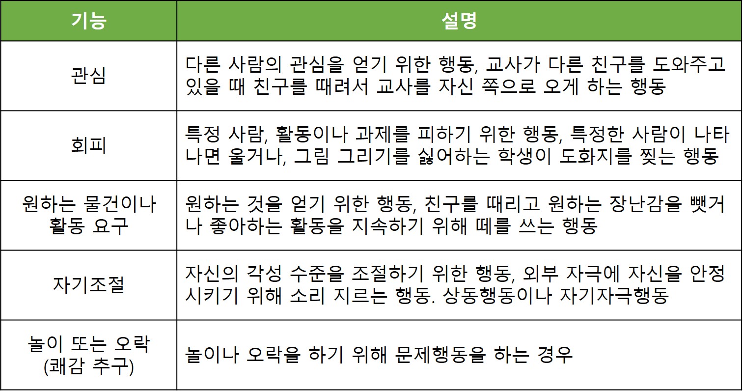 - 문제행동은 개인을 위한 기능을 제공한다.