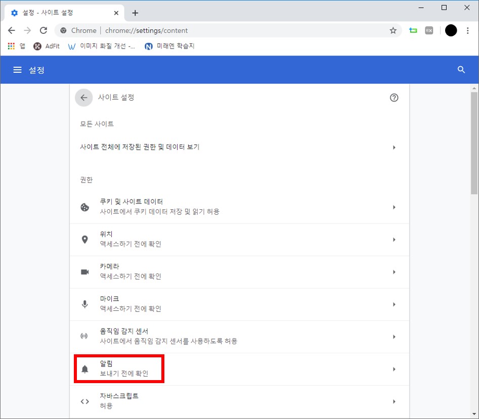 3. 사이트 설정 하위 메뉴 중 '알림'을 클릭한다.