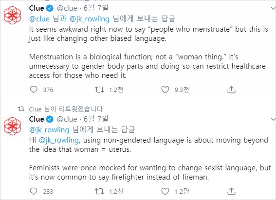 여성들의 생리 주기를 관리해주는 앱을 개발한 업체 '클루(CLUE)'가 공식 트위터 계정을 통해 조앤 롤링 비판에 가세했다. 클루는 '생리하는 사람'이라는 표현이 지금은 어색할지 모르지만 성차별을 훼파하는 개혁의 일환으로서 바람직한 방향성이라는 의견을 냈다. 그런데 웬일인지 도리어 여성들로부터 외면 당하는 분위기이다.