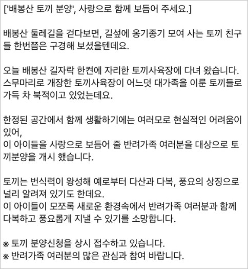 기하급수적으로 늘어난 개체 수를 감당하기 어려워진 동대문구는 급기야 지난 5월, 토끼들을 구민들에게 무료로 분양하기에 이른다. 유덕열 동대문구청장이 직접 자신의 페이스북에 토끼 분양을 이벤트로 홍보하기까지 했다. 내용을 보면 본인도 토끼의 번식력이 왕성하다는 사실을 본인도 충분히 알고 있다. 하지만 실수로 토끼가 늘었다고 인정하기는 커녕, 다산과 다복, 풍요의 상징으로 알려져 있으니 데려가 키우라고 해맑게 권장하고 있었다.