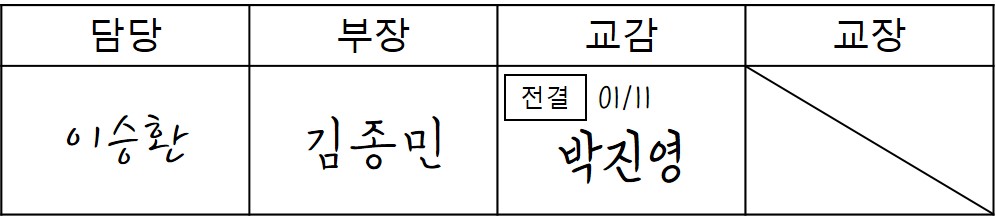 그리고 4항에 서명 또는 전결표시를 하지 않는 사람의 서명란은 만들지 않는다고 했기 때문에 교장 서명란은 만들지 않거나, 이미 만들어져 있어 어쩔 수 없을 때에는 대각선을 긋는 등의 방법으로 삭제를 하는 것이 맞다.