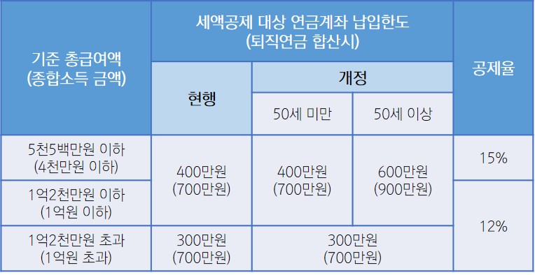 노후 대비가 필요한 50대 이상자에 대해 세액공제 대상 연금계좌의 납입한도를 3년간 한시적으로 상향했다. 단, 총급여액 1억 2천만원(종합소득 1억원) 초과자나 금융소득 종합과제 대상자는 제외된다.