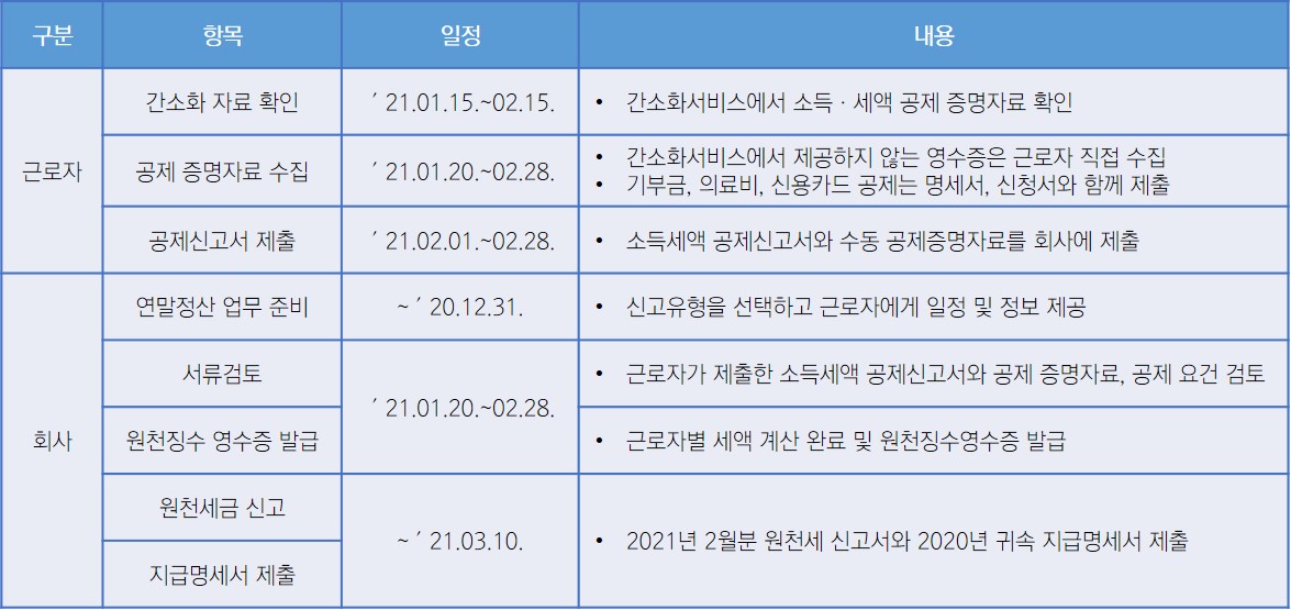 2021년 1월 15일부터 국세청 홈택스에서 제공하는 연말정산 간소화 서비스 페이지에 들어가 소득공제, 세액공제 증명자료를 확인하고 인쇄하여 소득세액 공제신고서를 작성하고, 간소화 서비스 자료에 누락된 영수증이나 자료들을 수집하여 신고서를 보완한 후 증명서류와 신고서를 회사에 제출한다.