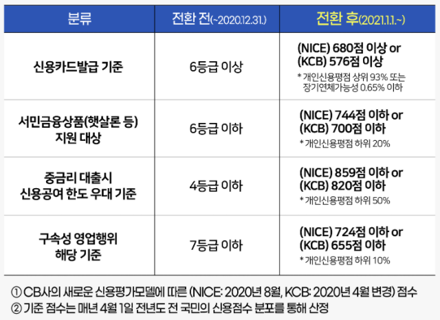 2021년 1월 1일부터 개인신용평가를 등급으로 산정하던 신용등급제가 폐지되고 신용점수제가 전면 시행되었다.