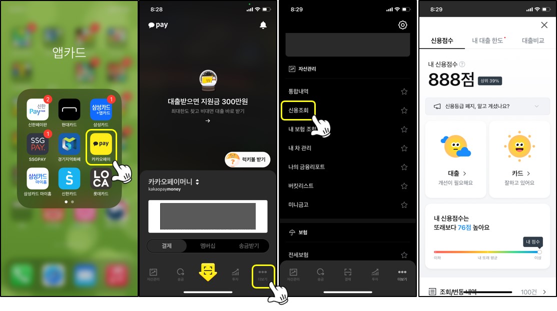 NICE 지키미(https://www.credit.co.rk/)나 KCB 올크레딧(https://www.allcredit.co.kr/)와 같은 CB사 홈페이지에서는 유료 서비스에 가입해야만 신용점수를 확인할 수 있지만, 카카오페이나 토스와 같은 핀테크 앱을 이용하면 무료로 간편하게 확인할 수 있다. 두 앱 모두 KCB(올크레딧)의 정보를 가져오므로 어느 것을 이용하든지 조회되는 신용점수는 똑같다.