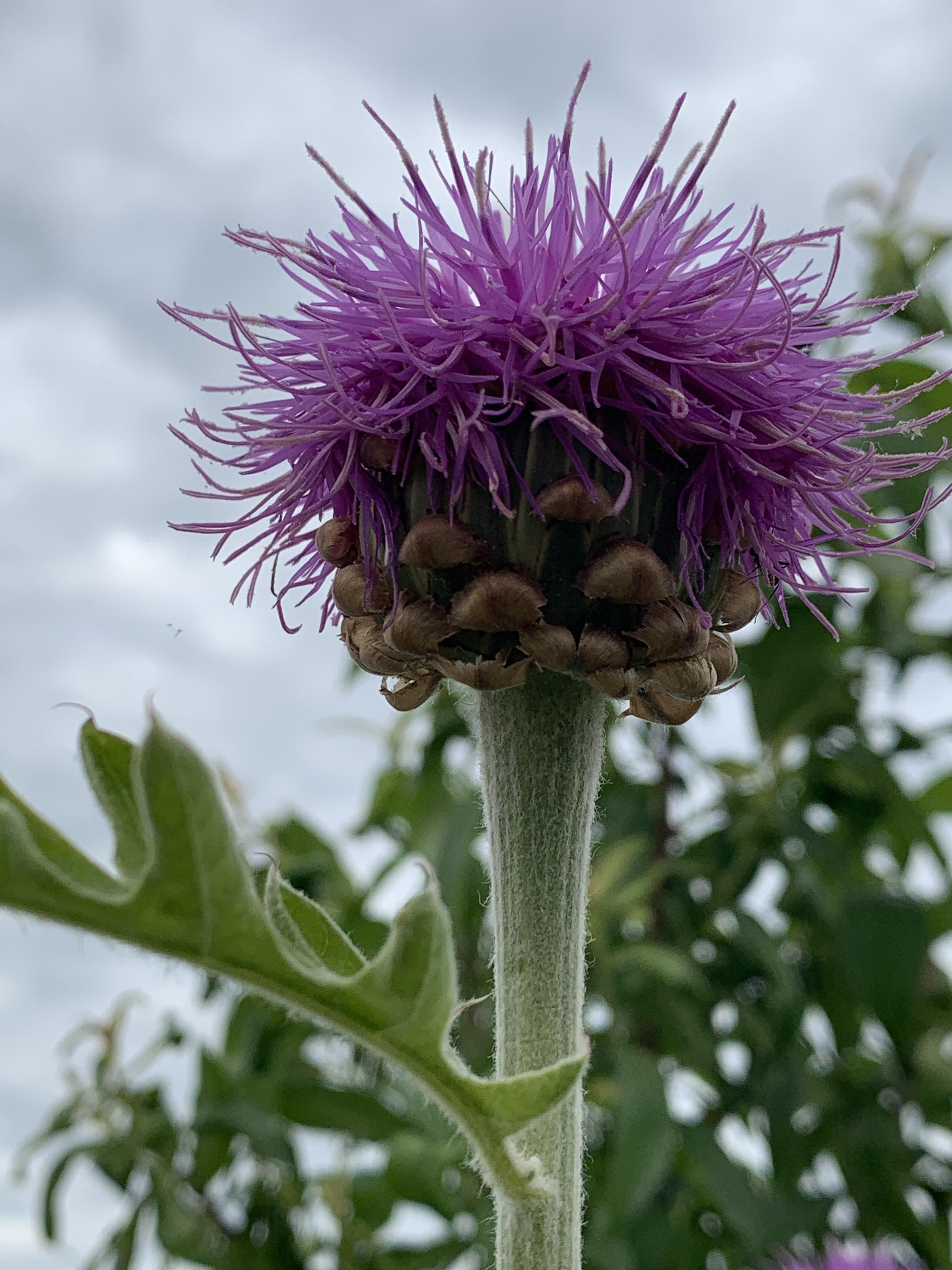 개화시기는 5~8월경이며, 줄기 끝에 홍자색(붉은 보라색)의 꽃이 두상화서(한 송이처럼 보이지만 여러개의 수많은 작은 꽃이 모여서 머리 모양을 이루는 꽃차례)로 달린다. 두상화의 지름은 약 6~9cm 정도이고 관모양이며 길이가 약 2~3cm, 화관의 끝이 5갈래로 갈라진다. 수술은 5개, 암술은 1개이다. 꽃이 커다랗고 아름다워서 화단이나 공원에 많이 심는다.
