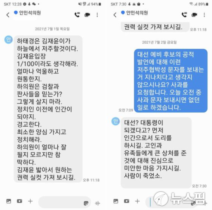 안민석 의원이 하태경 의원에게 보낸 문자 메시지의 내용을 두고 하태경 의원은 협박성 저주성 문자로 표현하면서, "이런 분이 계속 국회의원을 해도 좋은지 국회 윤리위원회에 제소하여 판단을 구하겠다"고 밝혔다.