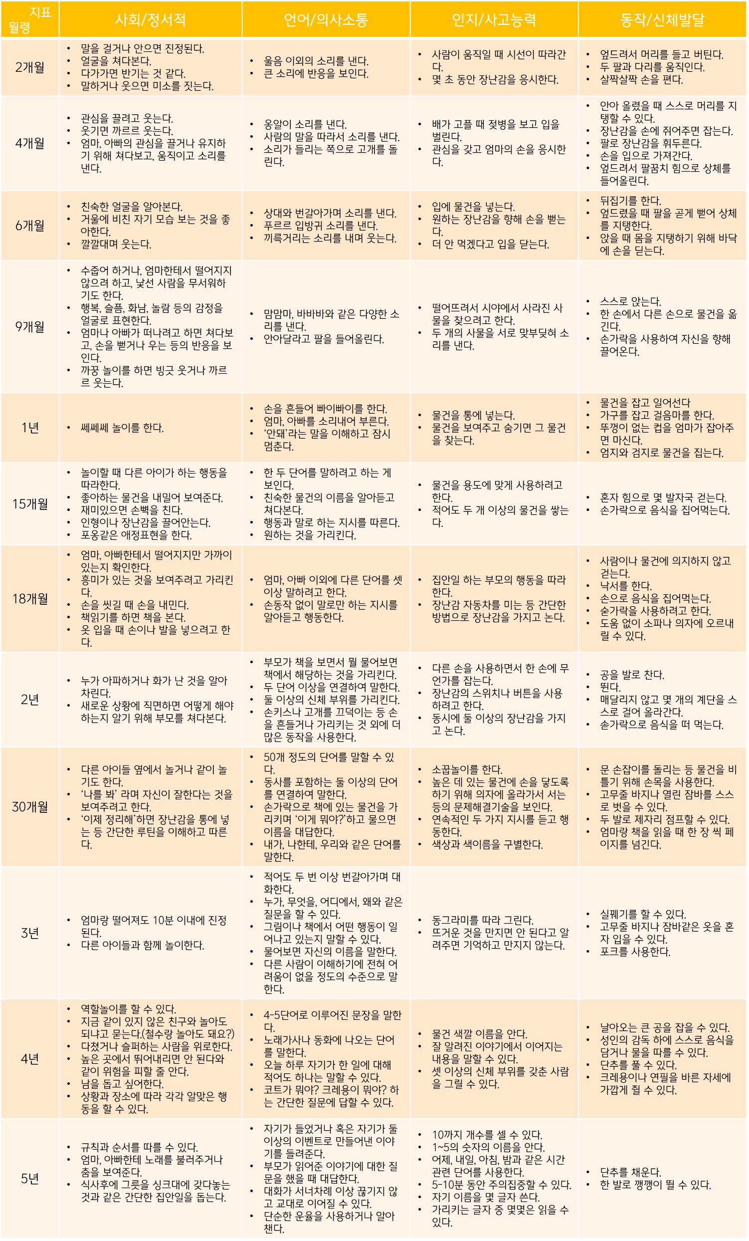 미국 질병통제예방센터에서는 아이들이 정상 발달을 하고 있는지 확인할 수 있는 월령별 발달 지표를 제시하고 있다.