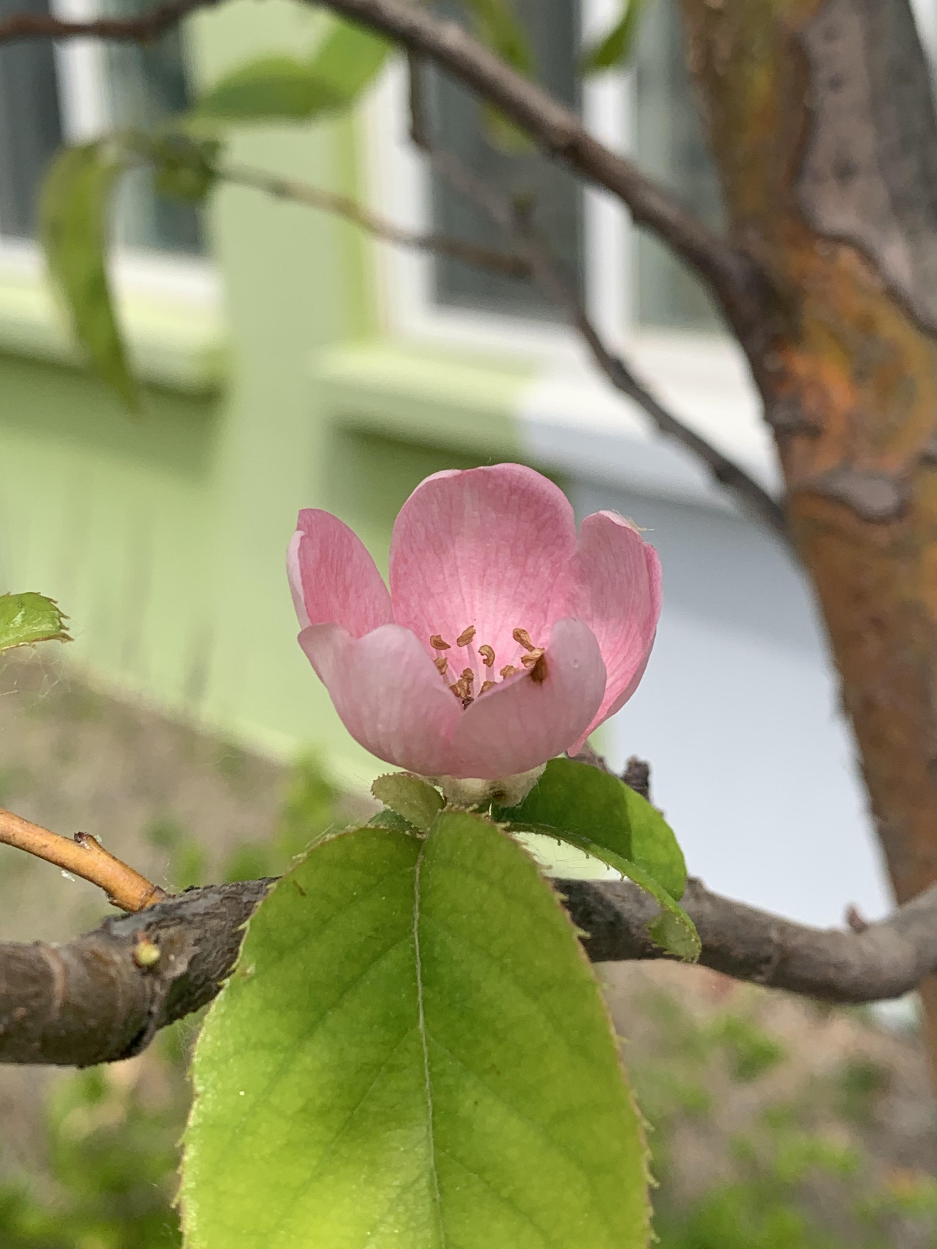 꽃은 지름 2.5~3cm 정도 크기의 분홍색 꽃으로, 꽃잎은 5장, 둥그스름한 도란형(계란을거꾸로 세운 모양. 거꿀달걀형이라고도 함)이며, 잔가지 끝에 한 송이씩 핀다. 꽃받침대는 짧고 꽃받침통은 종모양이고 끝은 5열, 꽃받침은 5개이다. 암술머리는 5개로 갈라지며 수술은 약 20개 정도 된다. 4~5월경에 개화하여 6월경까지 볼 수 있다. 꽃말은 평범, 유혹, 유일한 사랑 등이라고 한다.