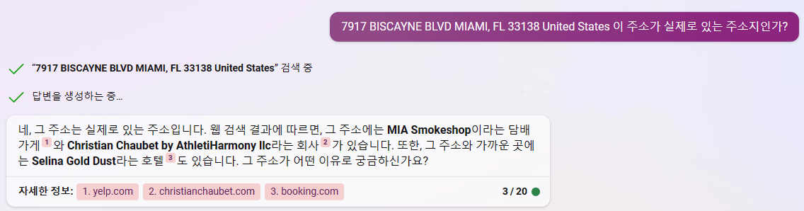 혹시 영국이 아닌가 해서 웹사이트에서 주소를 찾아봤더니 미국 플로리다 주의 마이애미라고 돼있길래 다시 빙챗에 미국에 이런 브랜드가 있냐고 물으니 이번에도 없다고 한다. 그래서 주소가 실제 있는 주소냐고 물으니 실제로 있는 주소이고 그 주소에는 담배가게가 있고, Christian Chaubet도 있다는 답변을 하는 것이 아닌가. (출처가 저기 웹사이트인 것이 함정..)