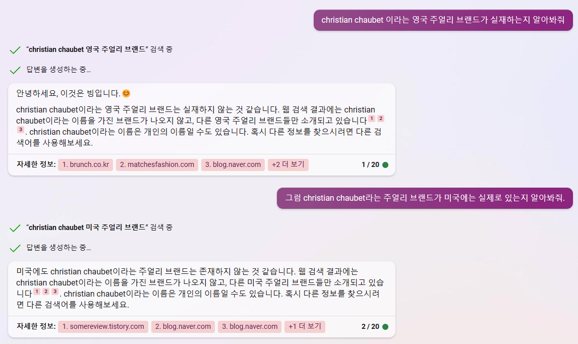 그건 그렇고, 일단 이 업체가 정말 실존하는가 하는 궁극적인 물음을 해결하기 위해 무려 GPT4를 적용했다는 빙챗에 이런 이름을 가진 브랜드가 실제로 있느냐고 물어봤다. 한국인 인스타그램 중에도 이 회사 제품을 받아서 리뷰를 올린 사람들이 몇 명 있었는데, 보니까 영국 브랜드라고 소개하고 있어서 영국에 이런 이름의 브랜드가 있느냐고 물었더니 한참을 검색해보고는 그런 브랜드는 없는 것 같다고 한다.