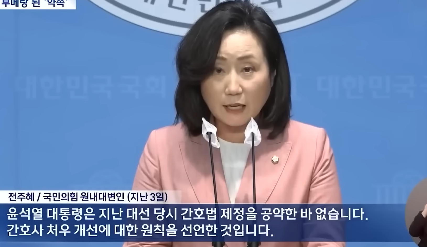 그럼에도 불구하고 국민의힘 원내대변인은 간호법 제정을 공약한 바 없고 처우 개선에 대한 원칙을 선언한 것이라는 성명을 발표했고, 대통령비서실장도 '대선 당시 간호법 제정을 공약한 바 없다', '합리적으로 결정하겠다는 정도만 언급했지 공식적인 약속은 하지 않았던 것으로 안다'고 공식입장을 밝혔다.