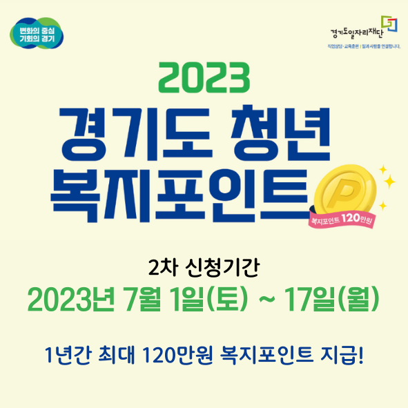 경기도에서는 경기도 소재 기업체에 재직중인 청년 근로자 총 3만 3천명에게 1년간 120만원 상당의 청년 복지포인트를 지급하는 사업을 진행중이다. 1차는 이미 4월에 신청 및 접수가 완료되었고, 7월 1일부터 2차 모집에 들어가 1만 1천명을 선정하게 되며, 3차 모집은 11월에 예정되어 있다.