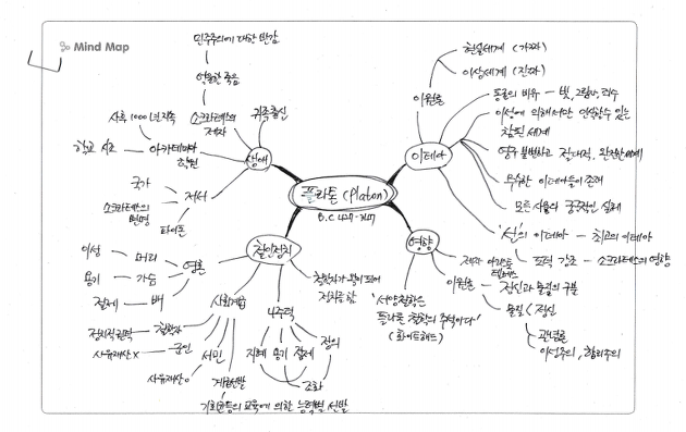 - 마인드맵: 생각그물, 개념지도라고도 하는데, 마음 속에 지도를 그리듯 이해하며 정리하는 방법이라고 할 수 있다. 공부한 내용이나 생각들을 시각적으로 표현하는 것으로, 핵심적인 단어나 색상, 그림 이미지를 이용해 필기한다. 이 방법의 장점은 세부 내용 뿐만 아니라 전체적인 내용을 한 눈에 알아볼 수 있어서 맥락을 이해하면서 중요 내용을 파악하는 데 있다. 또, 자신만의 도표나 그림으로 정리함으로써 흥미가 생긴다는 점도 장점으로 꼽힌다. 최근에는 마인드맵의 원리에 손그림을 많이 사용하는 비주얼씽킹도 많이 시도된다. 학습내용 이해 측면에서는 좋지만 그림을 그리는 데 시간이 많이 소요된다는 단점도 있어 개인적인 필기보다는 학교 수업에서 모둠 활동으로 많이 활용된다.
