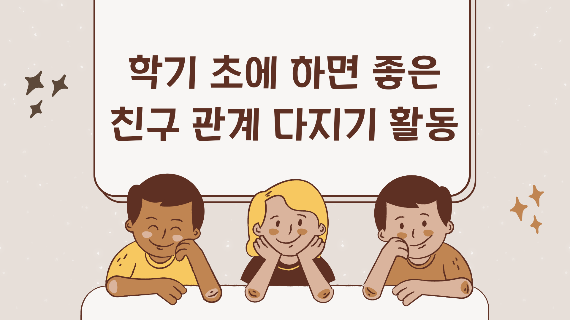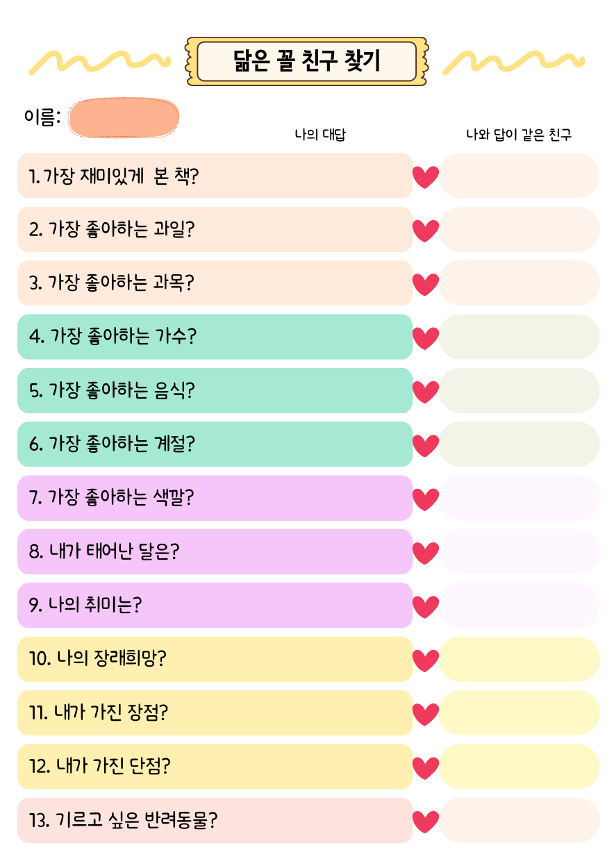 처음 다른 친구들과 관계를 맺을 때는 공통점을 찾아 대화의 물꼬를 트는 경우가 많습니다. 같은 관심사를 가진 친구와는 대화가 잘 통하기 마련이기 때문입니다. 그래서 나와 공통점을 가진 친구를 찾아보는 활동을 해 보도록 합니다. '이 사람을 찾아라!'와 같은 방식으로 진행해도 괜찮고, 좀더 느슨하게 자유도를 높일 수도 있습니다. 선생님의 재량껏 상황에 따라 선택하여 운영하세요.