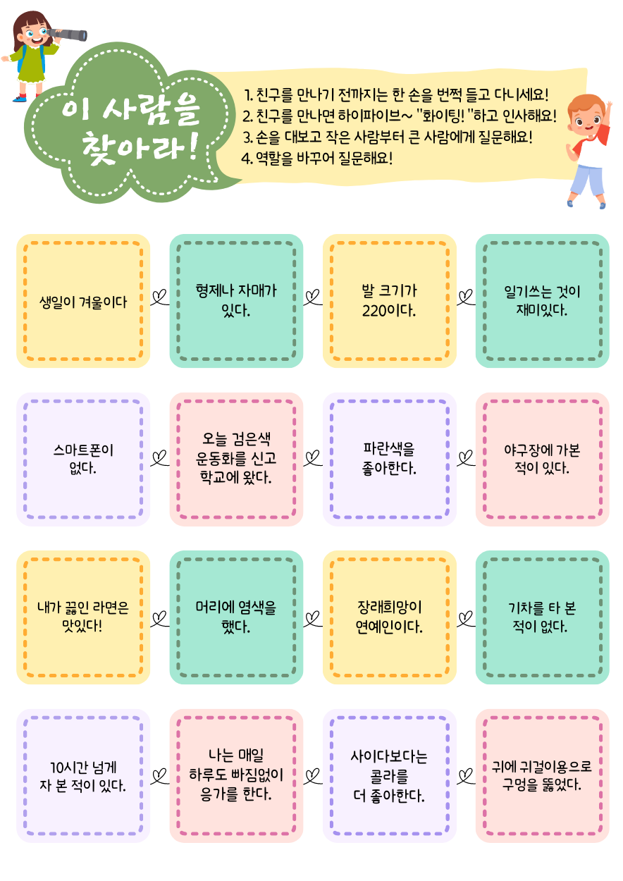 활동지를 받고 질문에 해당하는 친구를 찾아 이름과 사인을 받아오는 활동입니다. 서둘러서 빨리 할 필요가 없고 최대한 많은 친구와 이야기해 보는 것이 중요하다고 먼저 말해주세요. 먼저 끝나는 친구는 자리에 앉아서 기다리게 하되 아직 못한 친구가 질문을 하면 대답하고 사인해 줄 수 있습니다. 활동이 끝나면 칸이 채워진 활동지를 활용해 빙고게임을 하는 것도 좋은 방법입니다. 예를 들어 '발 크기가 220인 김철수!'라고 한 명이 말하면 나머지 아이들이 김철수의 이름을 지우거나 표시하는 방식입니다.