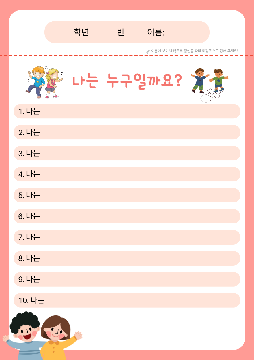 - 선생님이 나누어 주시는 종이를 받아 자기 이름을 쓴 다음 이름이 보이지 않게 뒤로 접습니다.