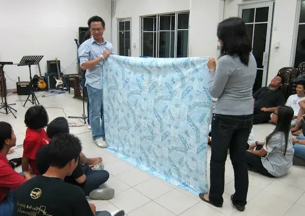 - 하나, 둘, 셋! 신호와 동시에 장벽(담요)을 내렸을 때 먼저 상대편 대표의 이름을 크게 외치는 팀이 이겨요.